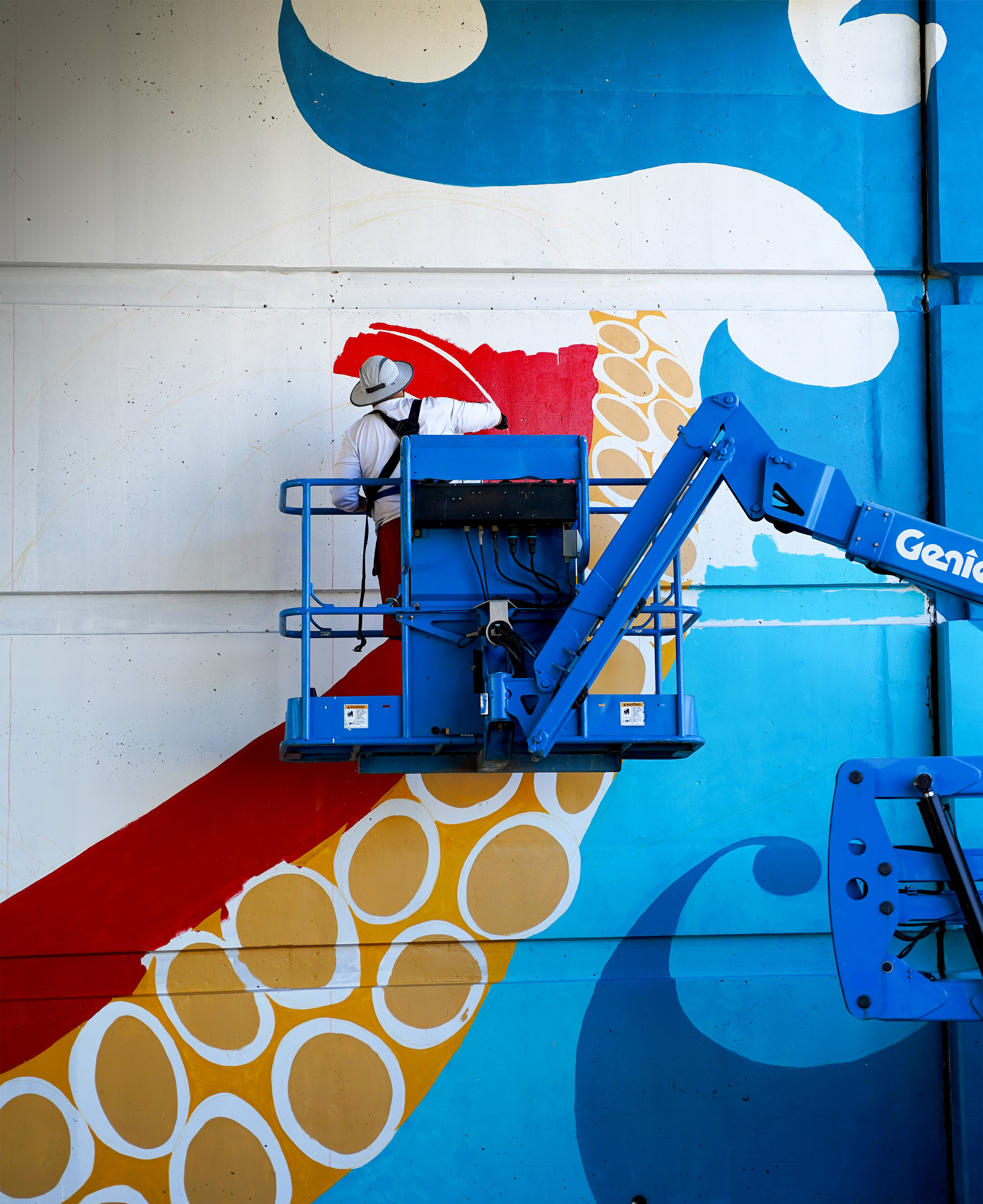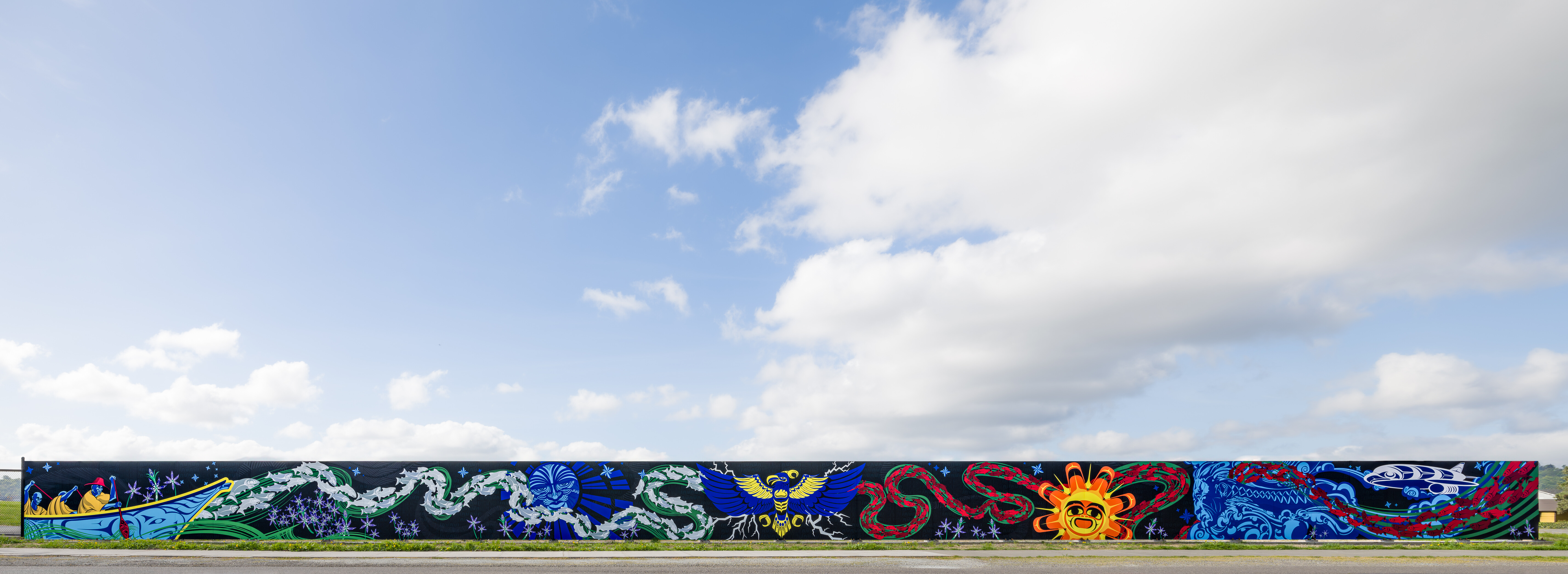 Beyond a visual appeal, Valu's creations carry thoughtful intent. His 160-foot long Georgetown mural, made in collaboration with Haida artist Tommy Segundo, centers on the Duwamish River, creating what Valu describes as a cyclical return to residence, and visual celebration of Indigenous connection to place. Titled Return on Investments, the mural was permanently installed at King County International Airport/Boeing Field in 2024. Visible from Airport Way South, it is seen by thousands of commuters each month as they travel alongside the north end of the airport.