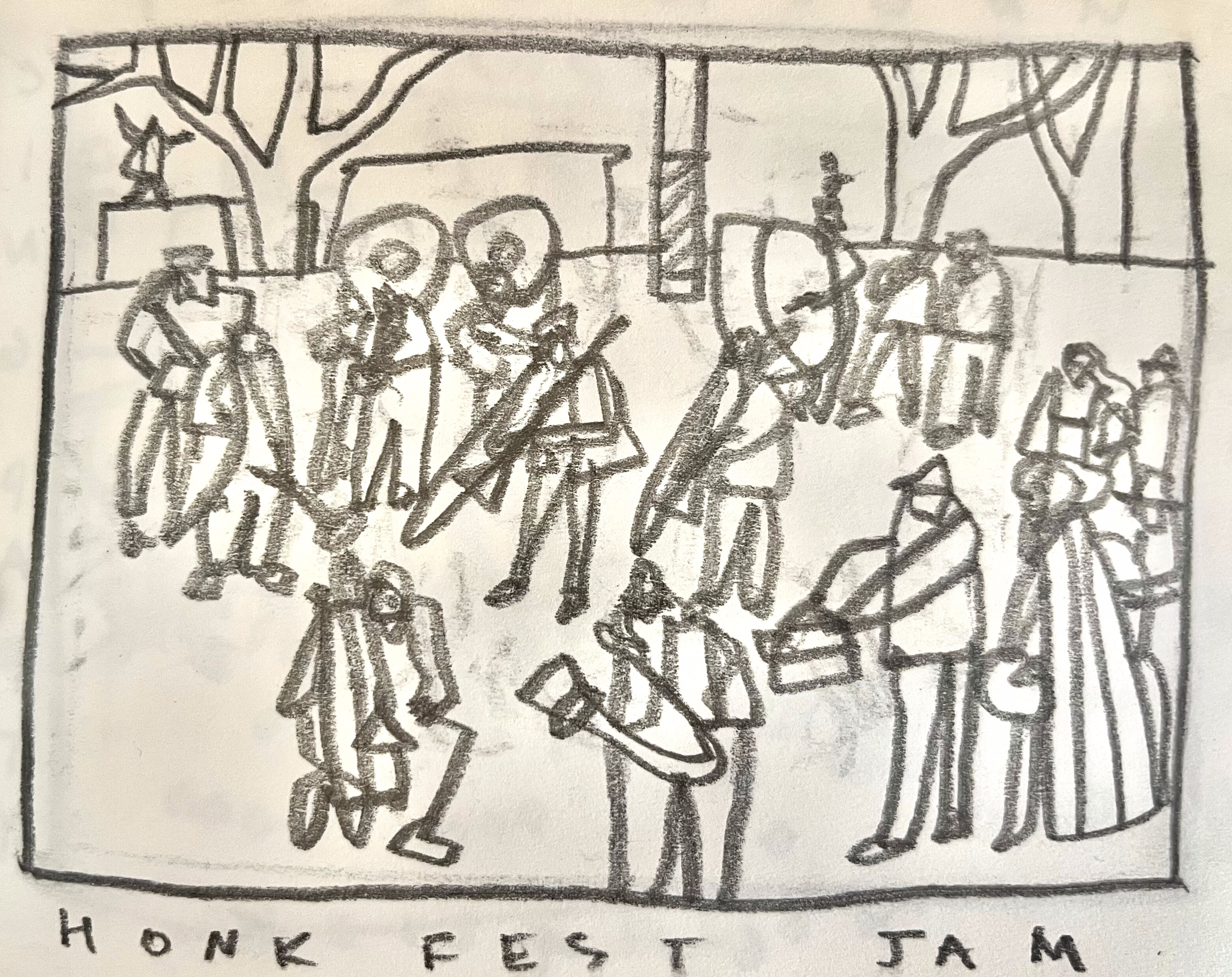 Tell us about your sketchbook practice. I began a consistent sketchbook practice in 2022. At the time, I was working as a teacher, and the shift from in-person to online classrooms had an impact on my health. To support my recovery, I started taking daily walks—using drawing as a reason to step outside. I’ve always loved drawing, so I gave myself a simple goal: find seven interesting things during each walk and draw them before returning home. Since then, my sketchbooks have evolved. I now make them by hand—binding the pages and creating covers from found cardboard. Once every page is filled, I finish the book by collaging or painting the cover. The entire process, from building the book to completing the final cover, brings me great joy. These books are filled with drawings of my surroundings, as well as studies of artwork that make me curious. Looking back at older drawings often makes me smile—they always turn out funnier than I remembered.
