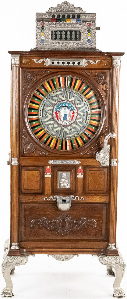 The "Mills 5 Cent 'Dewey' Jackpot Upright Slot Machine," crafted by an unknown artist, stands as a fascinating intersection of art, engineering, and cultural history. This piece, though not created with a painter's brush or a sculptor's chisel, is artful in its design and storytelling. Its presence in the museum attests to the richness of design and craftsmanship during the early 20th century. At first glance, one is immediately struck by the imposing structure of the machine, combining artistry with functionality. The woodwork, with its ornate carvings, evokes the refined elegance of the period. Every detail of the oak cabinet, from the intricately carved flourishes to the polished finish, reflects a deep appreciation for craftsmanship. The use of brass and nickel plating adds a touch of industrial brilliance, creating a compelling contrast with the warmth of the wood. Central to the machine's aesthetic appeal is the colorful spinning dial that dominates the front of the device. This wheel is not merely a mechanical component; it is a canvas of vibrant hues and shapes. The combination of reds, greens, and blacks draws the eye, while the bold 'Chicago' emblem in the center serves as both a focal point and a historical marker, situating the piece within a specific cultural and temporal context. In operation, the slot machine symbolizes the era's fascination with chance and fortune. The sturdy metal arm beckons players to engage with the machine, inviting them into a dance of risk and reward. The sound of coins clinking and the spin of the wheel evoke an atmosphere of anticipation and excitement typical of the roaring twenties. From a design perspective, the machine is an embodiment of the Art Deco movement, with its geometric shapes and lavish decoration. The metal script above the dial, proudly proclaiming "Mills Dewey," aligns with the text-based art that became popular during this time. This harmony between text and form adds an additional layer of depth to the piece, making it more than just a gaming instrument. The figurative embossing and metal embellishments might not only represent technological progress but also symbolize human ambition. During a time of rapid industrialization and urbanization, such machines were fixtures in bustling cities, offering a momentary escape from reality and a promise of quick riches. Sadly, the artist behind this remarkable piece remains unknown. This is not uncommon in the world of early industrial design, where many creators of functional yet beautiful objects went unrecognized. What can be appreciated is the anonymous artist's understanding of how art and utility can coexist. The machine showcases a seamless blend of decorative arts with mechanical ingenuity, testifying to the mind that valued both aesthetics and practicality. This piece fits within a broader narrative of the time, where entertainment and leisure were heavily influenced by technological innovation. Slot machines, like this one, were precursors to the modern gaming industry, and their design reflected contemporary societal values. In conclusion, the "Mills 5 Cent 'Dewey' Jackpot Upright Slot Machine" is a celebration of early 20th-century artistry and engineering. It serves as a reminder of the cultural and historical landscapes that informed its creation, offering viewers a glimpse into a past where the boundaries between art and technology were joyously blurred. While the creator of this work remains shrouded in mystery, their contribution to both design and cultural history continues to be celebrated and appreciated.